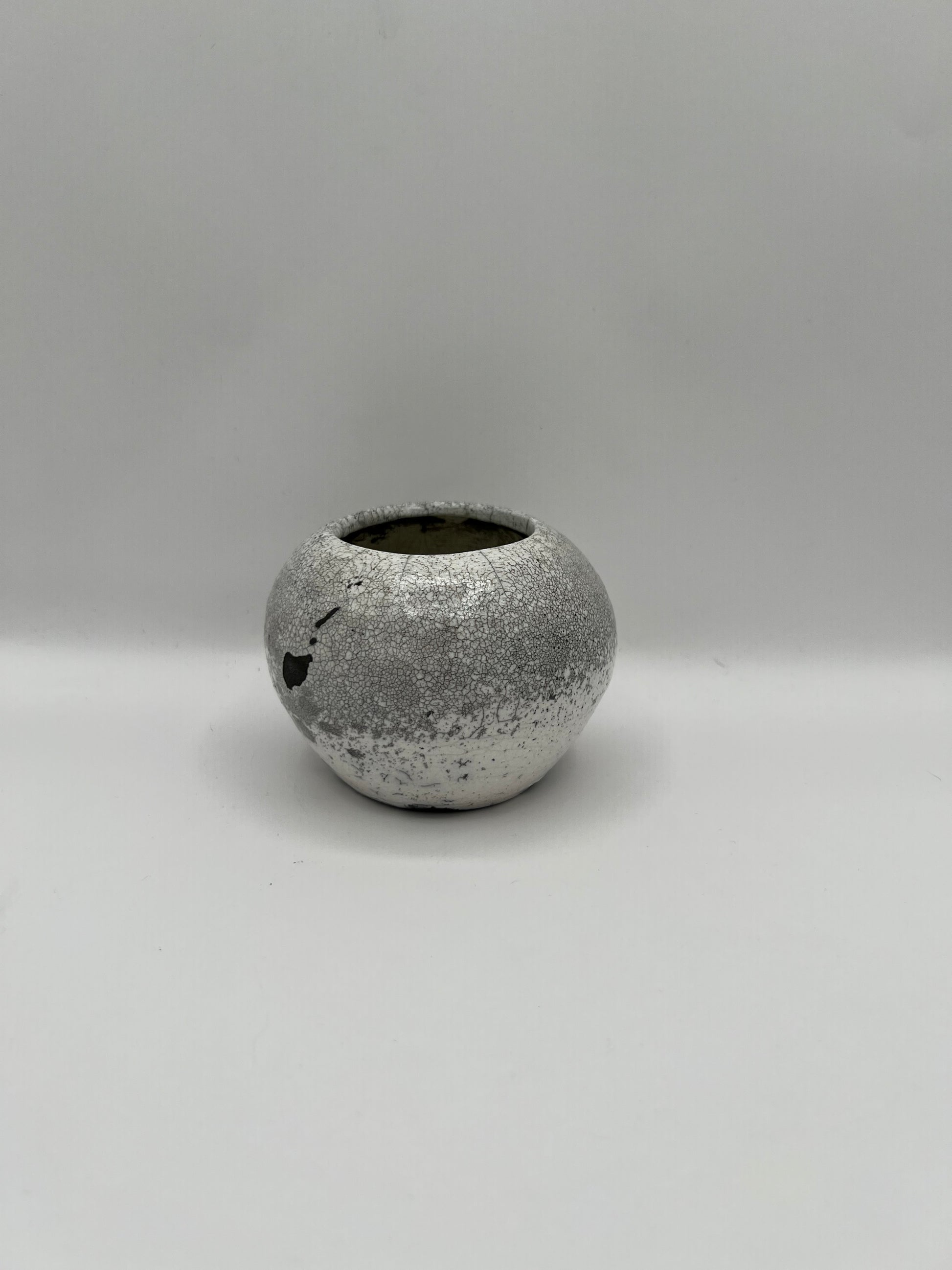 This decorative white Raku ceramic piece features delicate crackled textures created through the traditional Raku firing process, resulting in an ethereal, frosted surface with subtle smoky variation. Each handmade vessel is one of a kind, highlighting the organic beauty and unpredictability of Raku ceramics. Intended for display only, this piece is not food-safe or suitable for planting. Ideal as sculptural home décor, collector art, or a statement accent for modern and minimalist interiors.